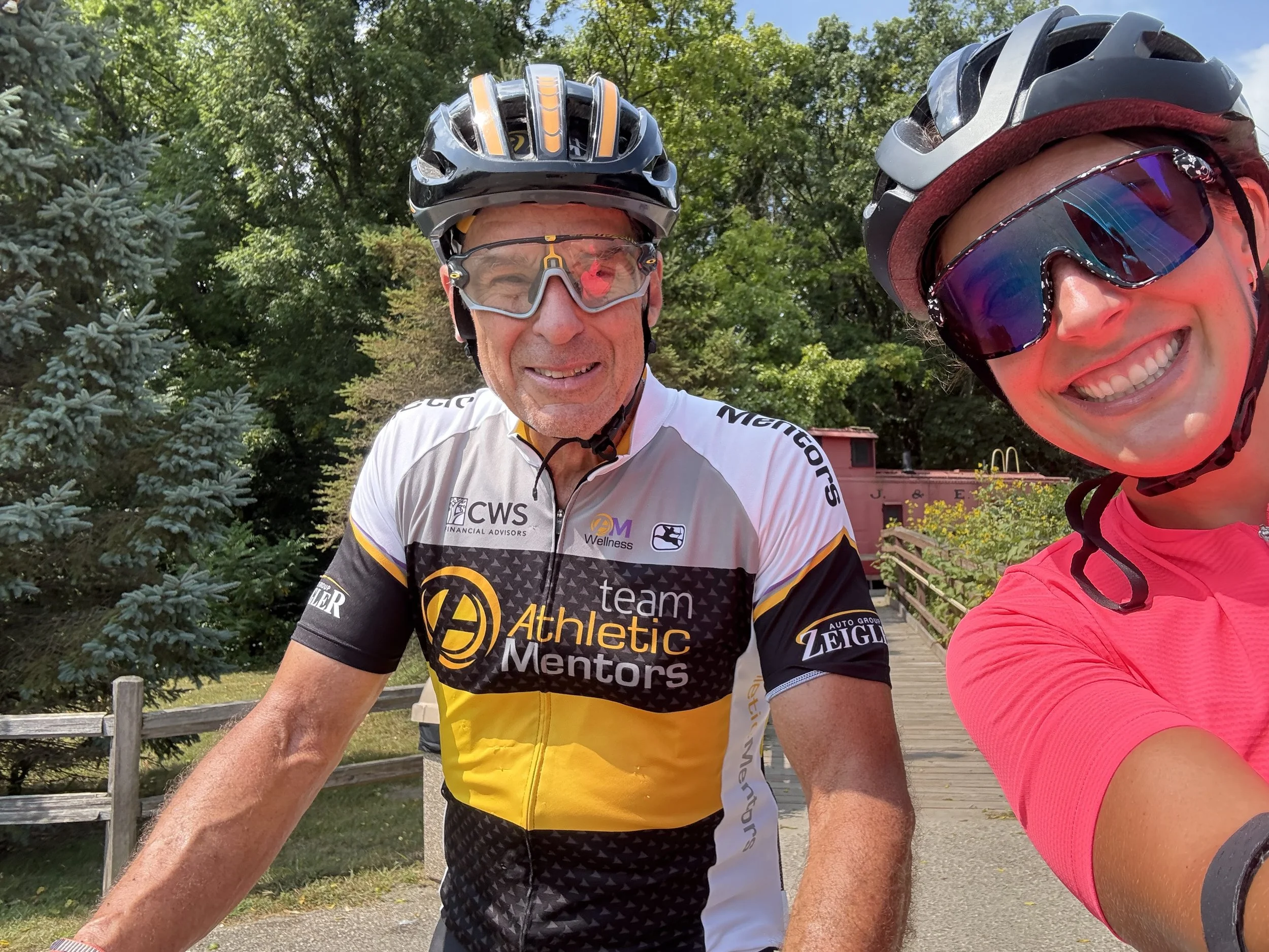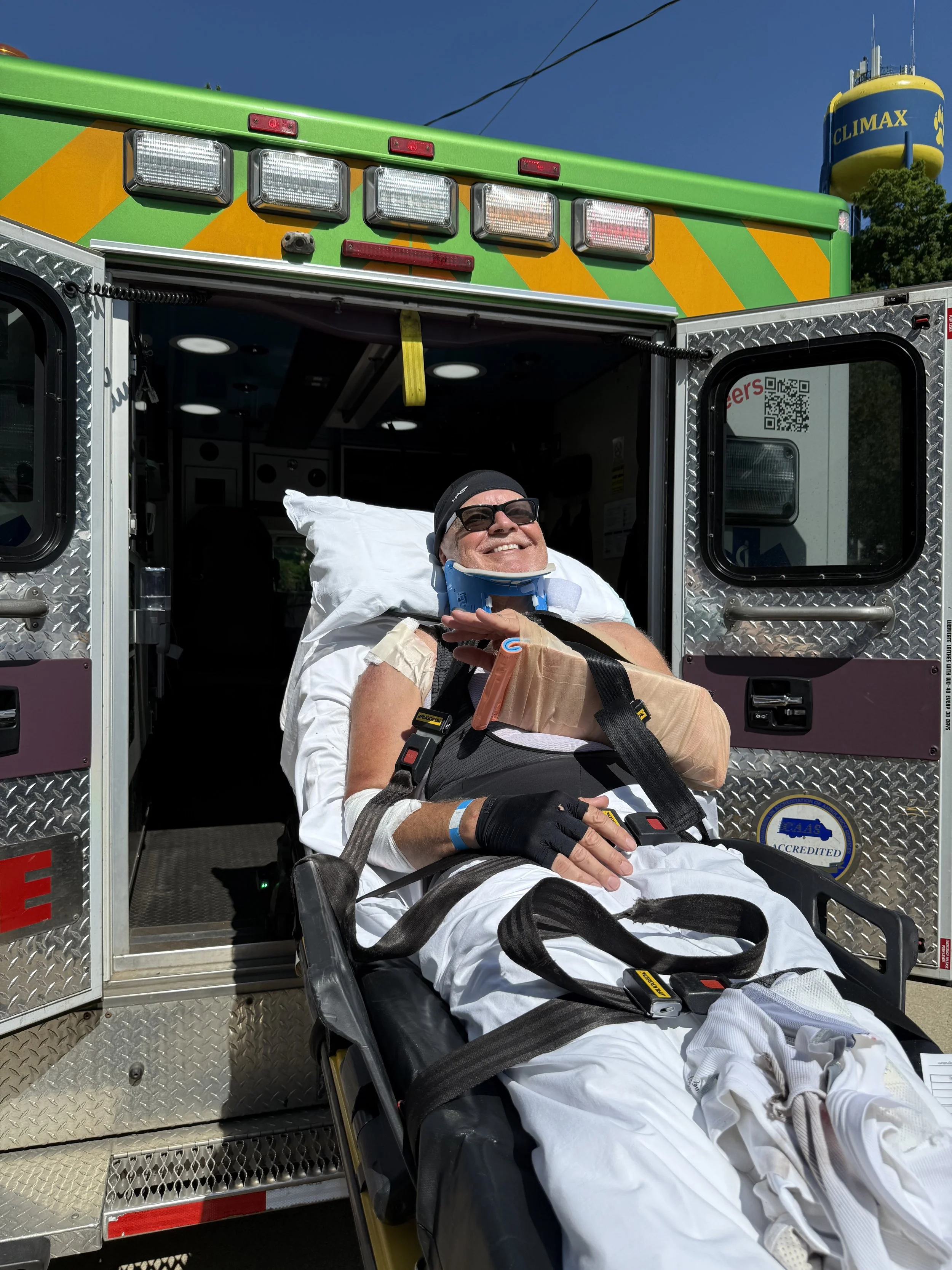 And last, but absolutely not least — my husband Steve. He started this training season as my number one riding partner, until a blown front tire sent him into a crash that landed us (thankfully) right in front of the Climax, MI fire department. From there, it was an ambulance ride to Bronson Hospital and the discovery of three broken ribs, a fractured radius, a concussion, and plenty of road rash. Even though he hasn’t been able to ride since, Steve has been my biggest cheerleader, mechanic, and support crew. I haven’t pumped up my own tires once this summer — my bike is always ready to roll thanks to him.